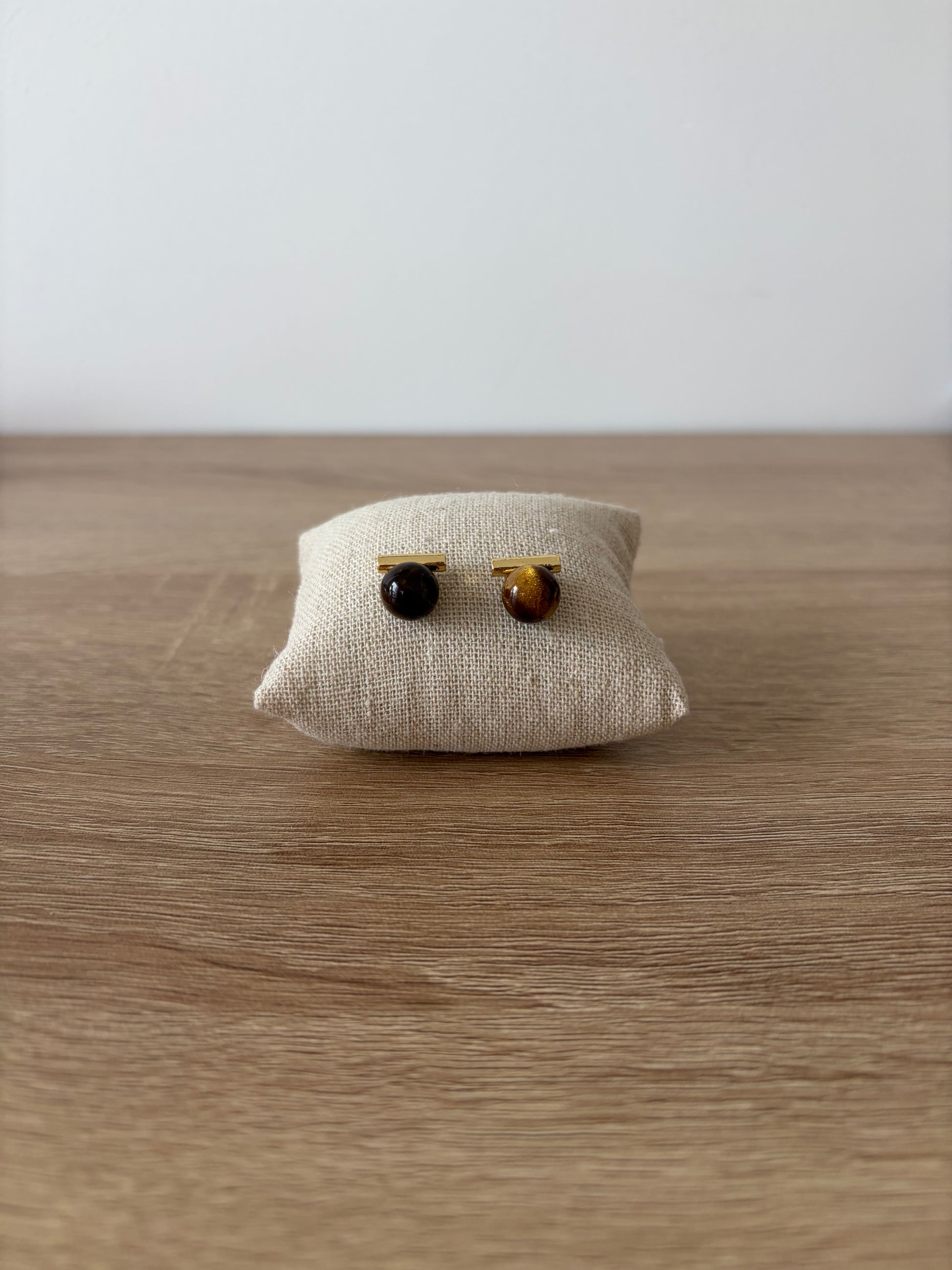 Leur base marron profonde se marie à la chaleur dorée et à l’éclat captivant de la pierre d’œil de tigre, qui capte la lumière à chaque mouvement.