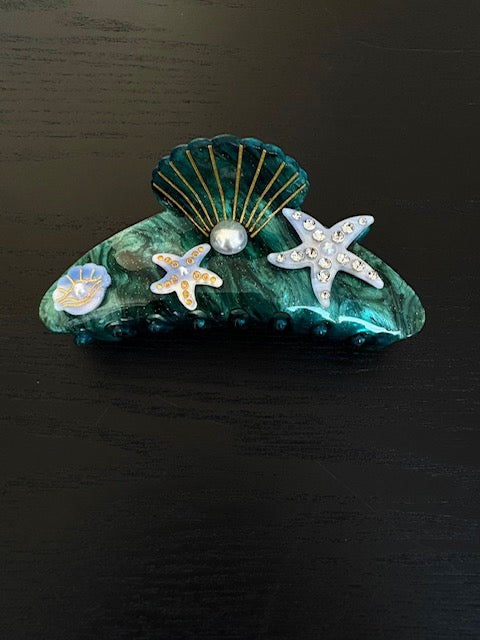 Élégante et originale, la pince « Azura » est un accessoire inspiré des trésors naturels du littoral. Son design travaillé combine textures marbrées et détails délicats en forme d’étoiles de mer, coquillage et perle, pour une touche d’évasion subtile dans votre coiffure.